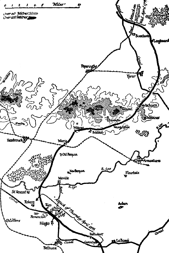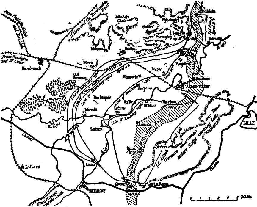 Both the first and this second phase of the German offensive concern chiefly the control of important railways. The object of the first was to put the Boulogne-Amiens-Paris line out of commission and this they have nearly accomplished. In this second phase the territory lies directly opposite Lille, which for the Boches is a great railway junction. On the Allied side, Hazbrouck and Béthune are the essential centres, the loss of which would seriously affect the lines of communication to the British front in the North.