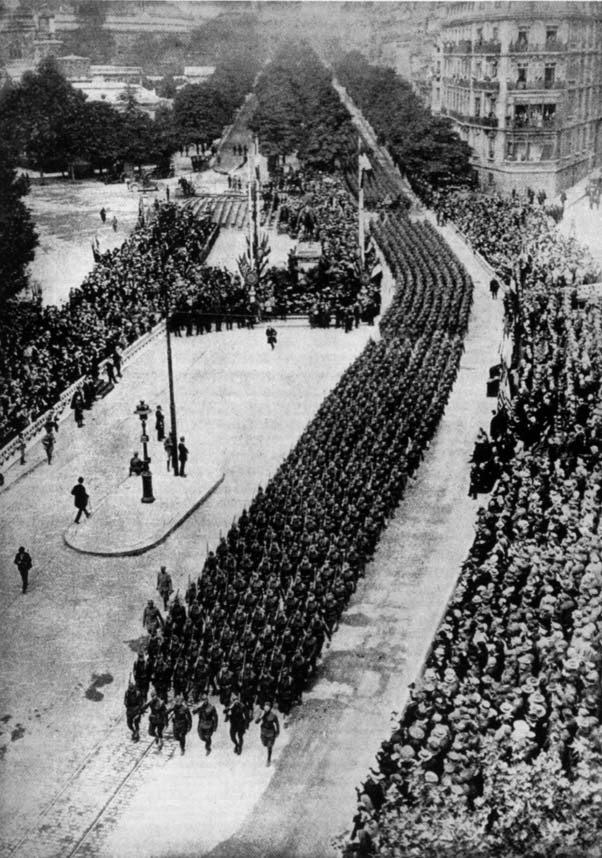 De Martel had sent word to say that the meeting of the Société de Neurologie was called off, and would I go with him and Major Jarvis, the C.O. of the Astoria Hospital, to see the review? No possibility of seats, but he had secured three tickets for standing room reserved in a balcony. Remembering the uncertainties of sitting astride a wall just a year ago, I accepted with alacrity. We joined the holiday crowd bound for the place of ceremonies, climbed the back stairs of a building on the corner of the rue Pierre-Charron and the Avenue du Trocadéro---after to-day to be the Avenue du Président-Wilson---and found ourselves on a narrow fourth-story ledge looking down on the Place d'Iéna. The broad thoroughfare down which the troops were to come stretched directly in front of us---the equestrian statue of Washington and reviewing stands past which they were to march lay just at our feet.