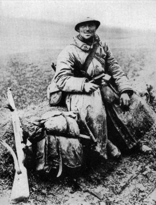 The early Boche trenches along the south side of the road with hand grenades in dumps and each man's allotment in a little cave dug in the bank. Belleau hamlet a sad and tottering wreck. Poilus harvesting the patches of oats between shell holes in the fields---poppies and chicory. Then Torcy and Bussiares---also tottering. Gun carriages and baby carriages thrown up by the roadside---nothing more incongruous than an old battered silk hat and an abandoned Boche helmet side by side in the ditch---baby carriages and top hats indicate refugees.