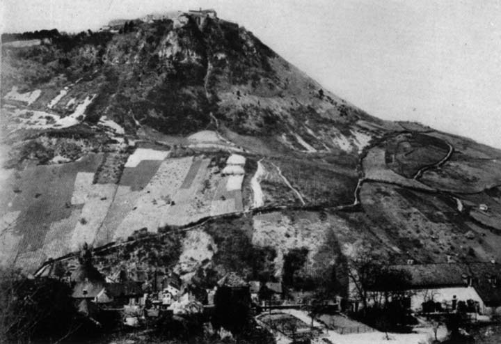 We were lucky enough to find Roussy, who promptly gave to us the rest of his day. He showed us the general plan of organization and then took us to the Besançon Hospital, used as a neurological triage. After seeing some of the neurosurgical cases there we departed for Salins, some twenty-five km. to the south, where the psychoneuroses are sent to be treated. Despite the rain, a wonderful trip across country, with charming views, along deep valleys, of the winding Doubs and its tributaries. Salins itself a healing salt spring, as its name indicates-is a most fascinating village stringing along, with what foothold it can get, in the crack between two towering heights, each of them surmounted by one of the subsidiary forts of the Besançon cluster. One of these was our objective, and Holbrook, who had already skidded badly in dodging an ambulance when leaving Besançon, looked at the road askance; but up we went, a most wonderful view unfolding before us.