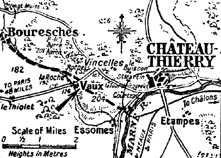 On Sunday the 21st, the day of the Séry-Magneval mess, Franco-American troops moved up practically to the Soissons-Château-Thierry road, seriously threatening the enemy's line of communication. Château-Thierry was taken and they were forced to make a complete withdrawal north of the Marne. They began extricating themselves cleverly behind a screen of smoke and machine guns---meanwhile excusing their withdrawal by similar methods in the communiqués.