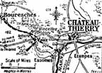 "Courthiezy and Reuilly with Italians---then the curve in the river across which lie Barzy and Jaulgonne, with quite precipitous highlands beyond and where our boys somehow got across. Moulins, where was the 2nd Batt'n of the 3rd Division, and Crezancy; then Fossoy---the present Divisional Hq. for the 3rd; and finally Chierry, where No. 1 Mobile and No. 6 Evac'n are found pitched together in a wet field."