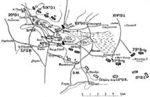 Malgré ce renfort, la division occupera encore un front de 6 kilomètres à vol d'oiseau, avec des unités très diminuées, une artillerie éprouvée (une batterie ne ramène en effet qu'une pièce; les autres sont démontées). Il ne me reste, comme réserve, qu'un bataillon de tirailleurs de 600 hommes environ.