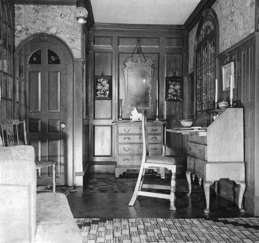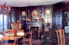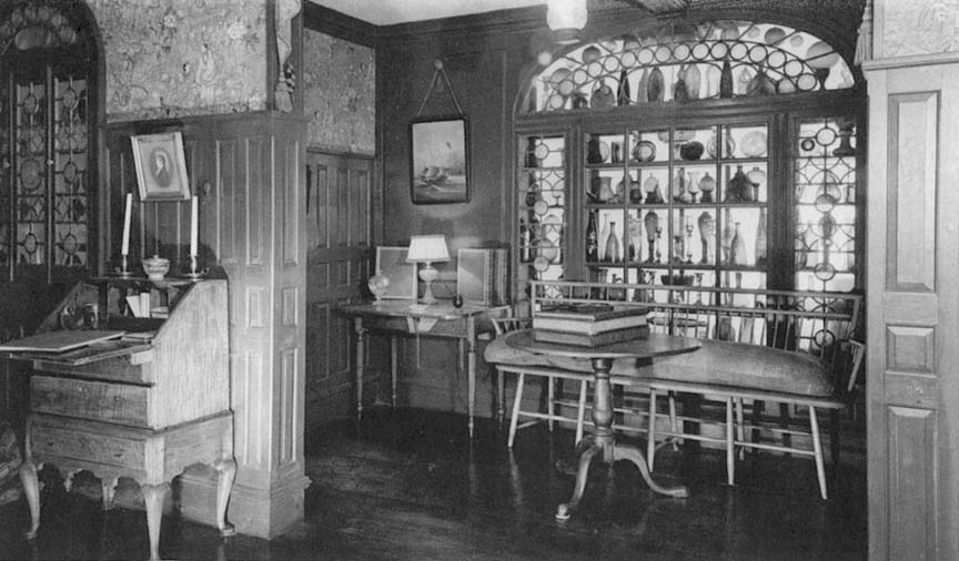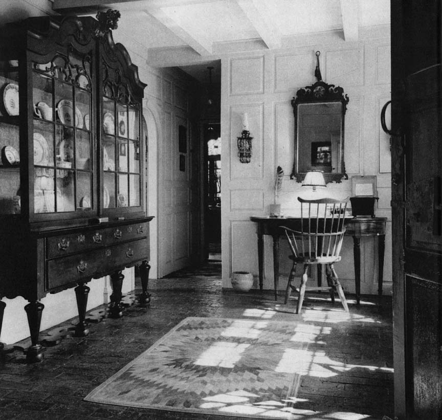 | Here is where we enter, where Beauport began its growth around panelling from the William Cogswell House in nearby Essex. The notable trumpet-leg cabinet (left) houses Chinese Export porcelain made for a Portuguese noble, from Mrs. McCann's collection. A harlequin hooked rug softens the waxed-brick floor. |