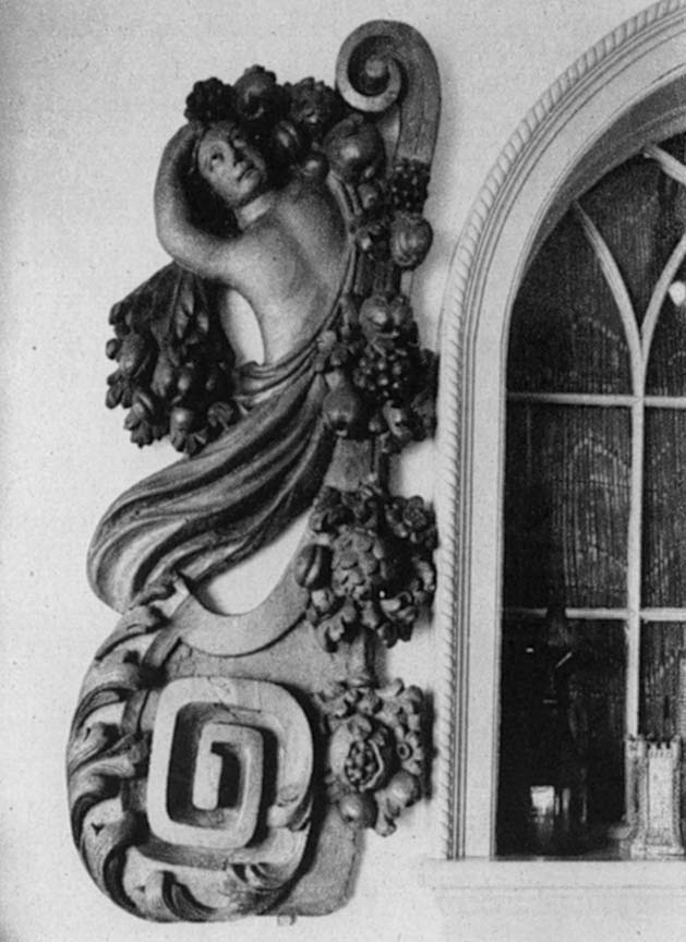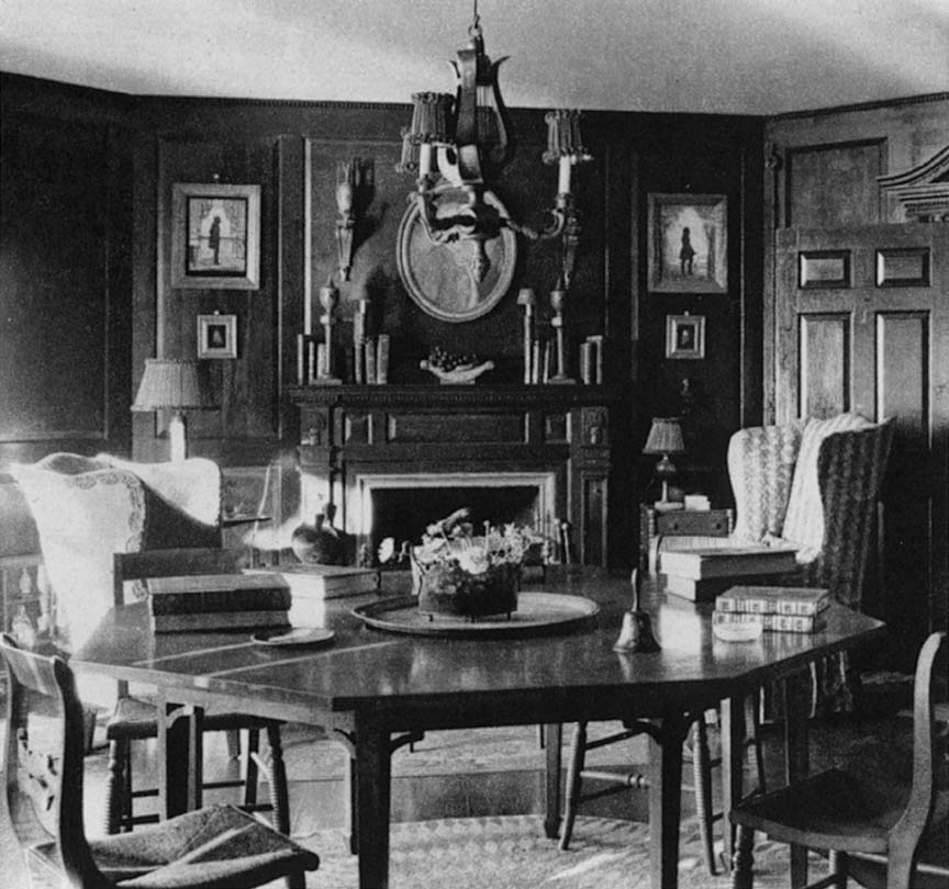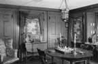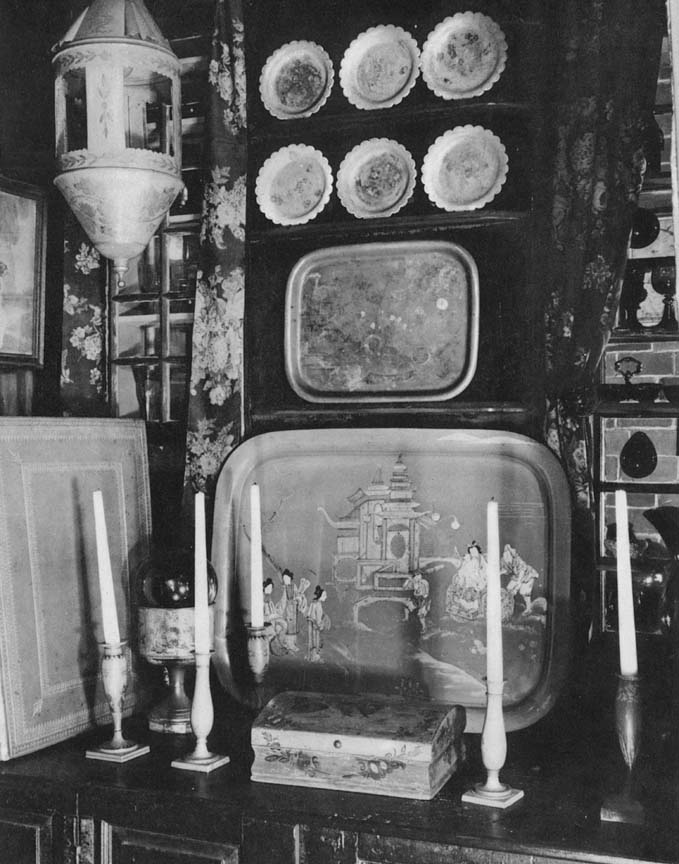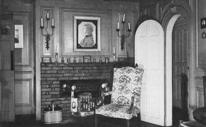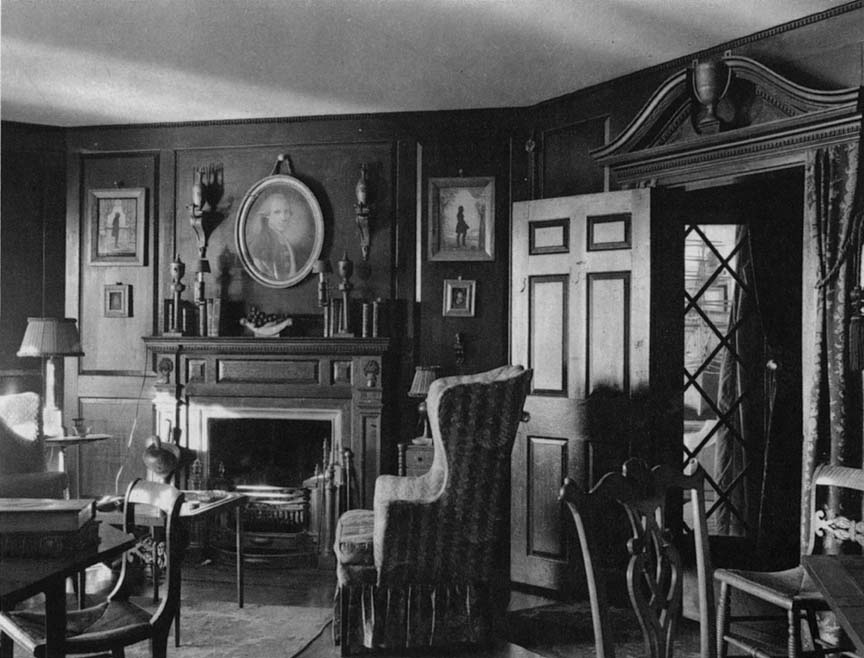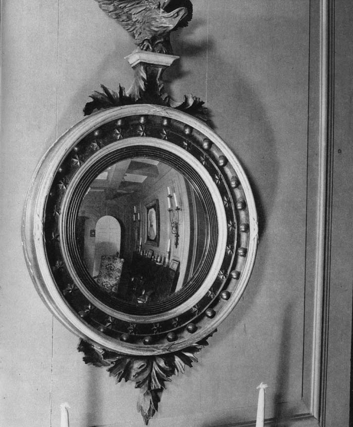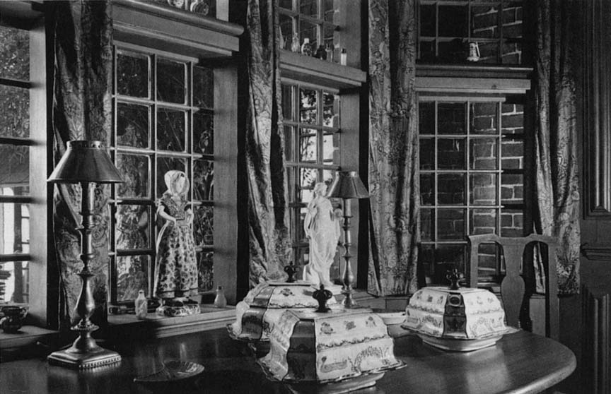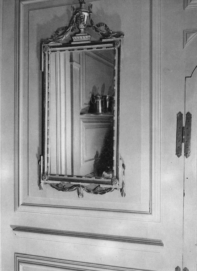 | All woodwork in this "first dining-room" is painted the green of the back of a laurel leaf, the floor is dark waxed-brick. The graceful Adam mirror picks up the copper on the ledge of the east wall. |