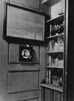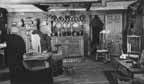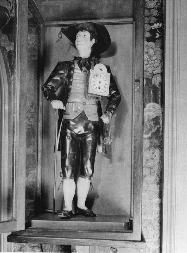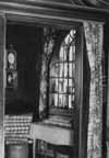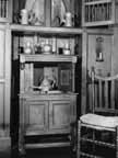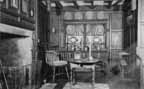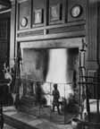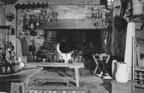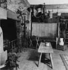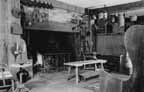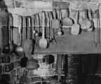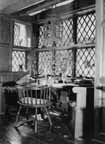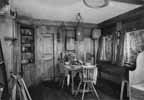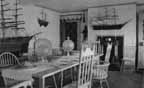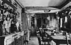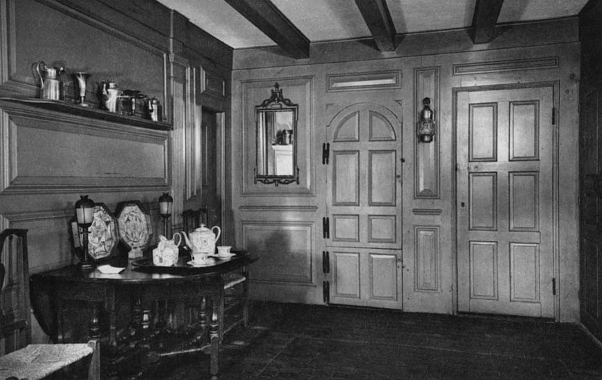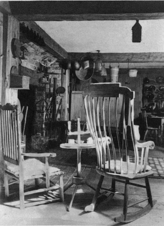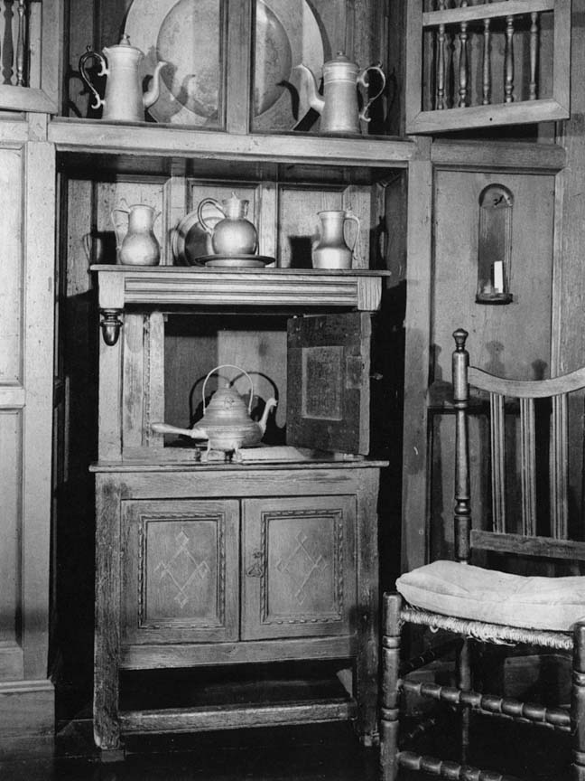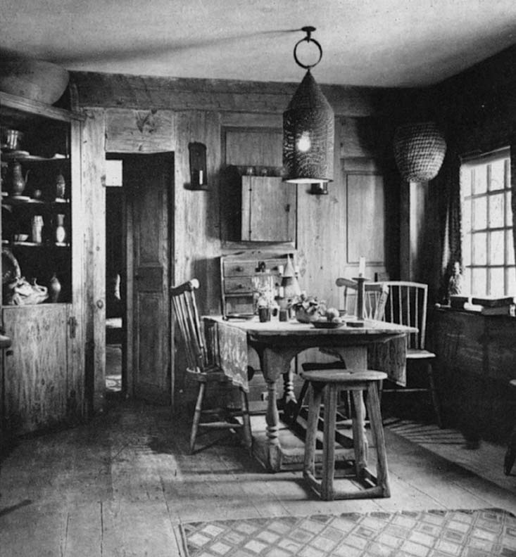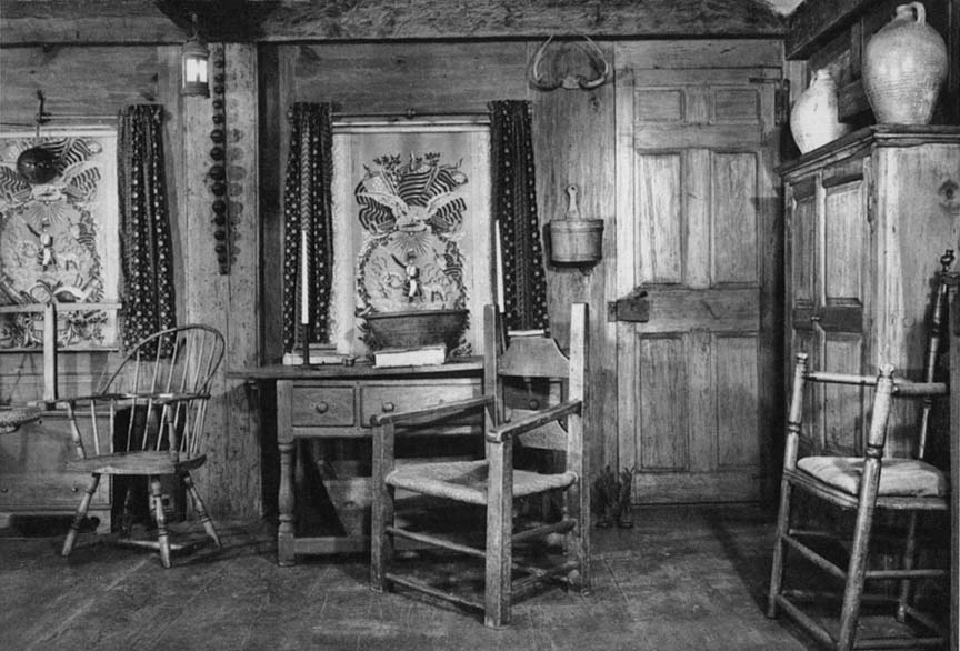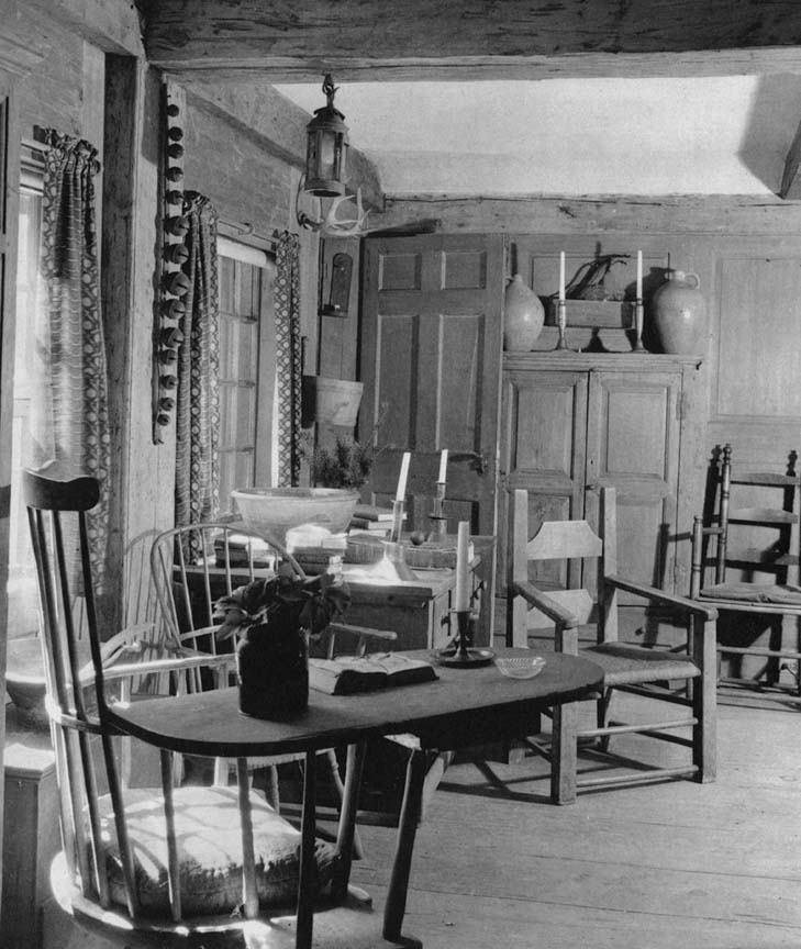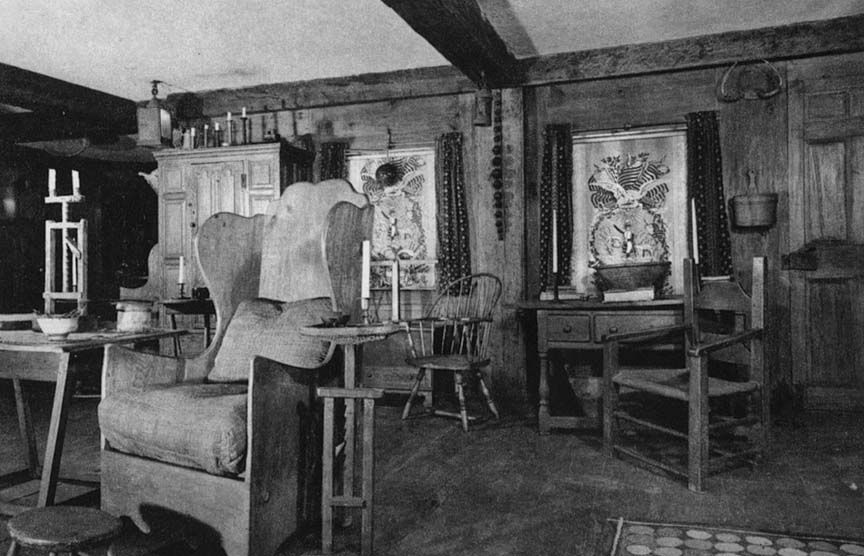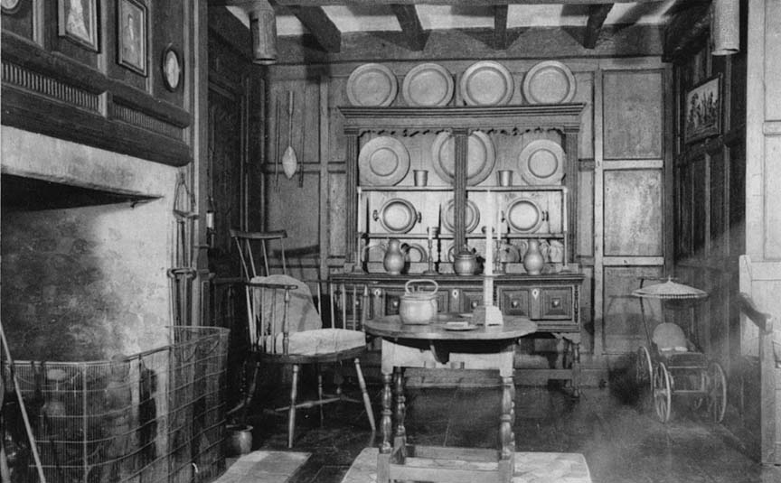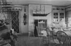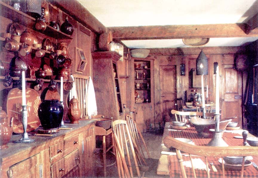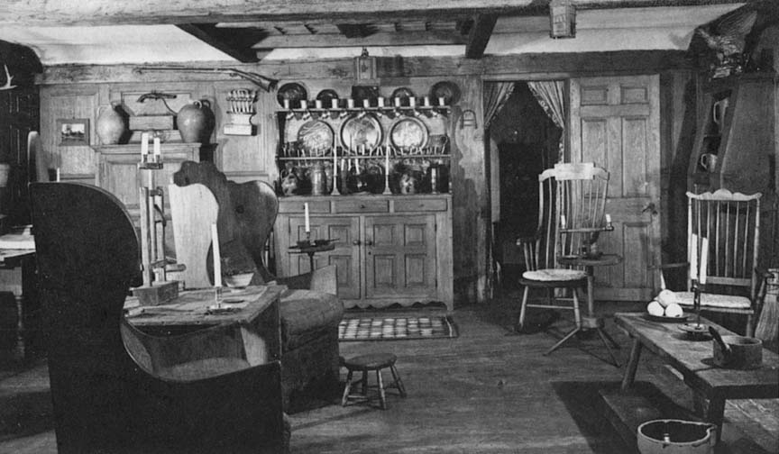 The tall fireside settle (left) curves inward to trap warmth and toast shins. Oak posts and beams, pine walls, and chimney brick are the room's basic materials. Deep in the fireplace are ovens and warming-ledges. On a crane hangs a noble iron kettle. |