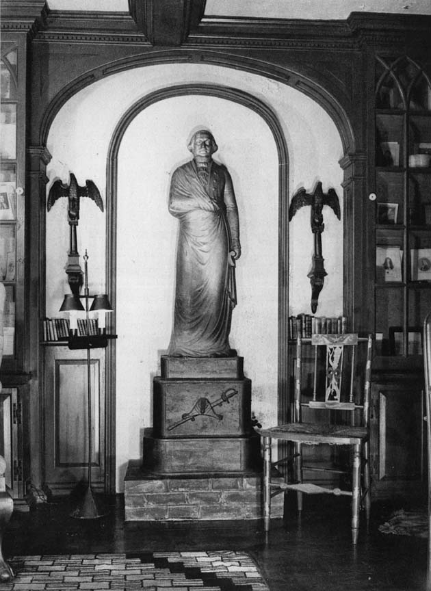 | General Washington, hollow, complete with toga, scroll, hat and sword, is an old Albany stove of most realistic warmth. His escorting eagles are repeated on the painted chair-top. |