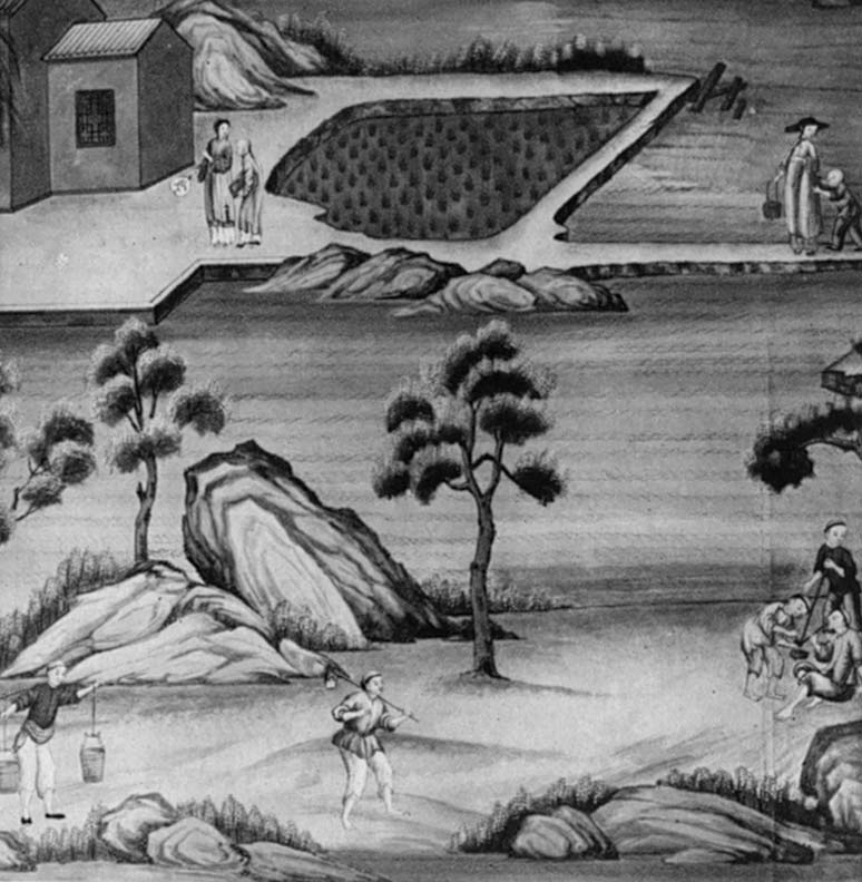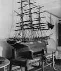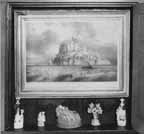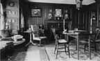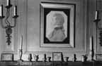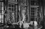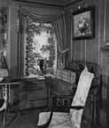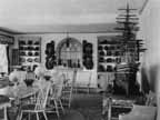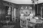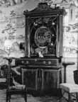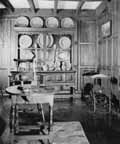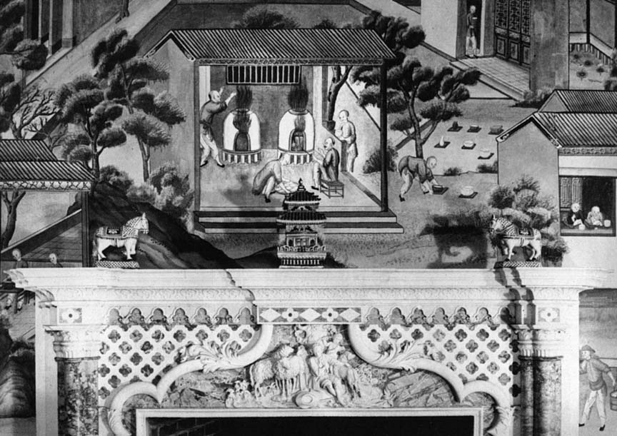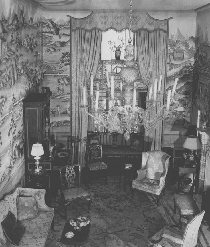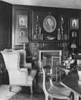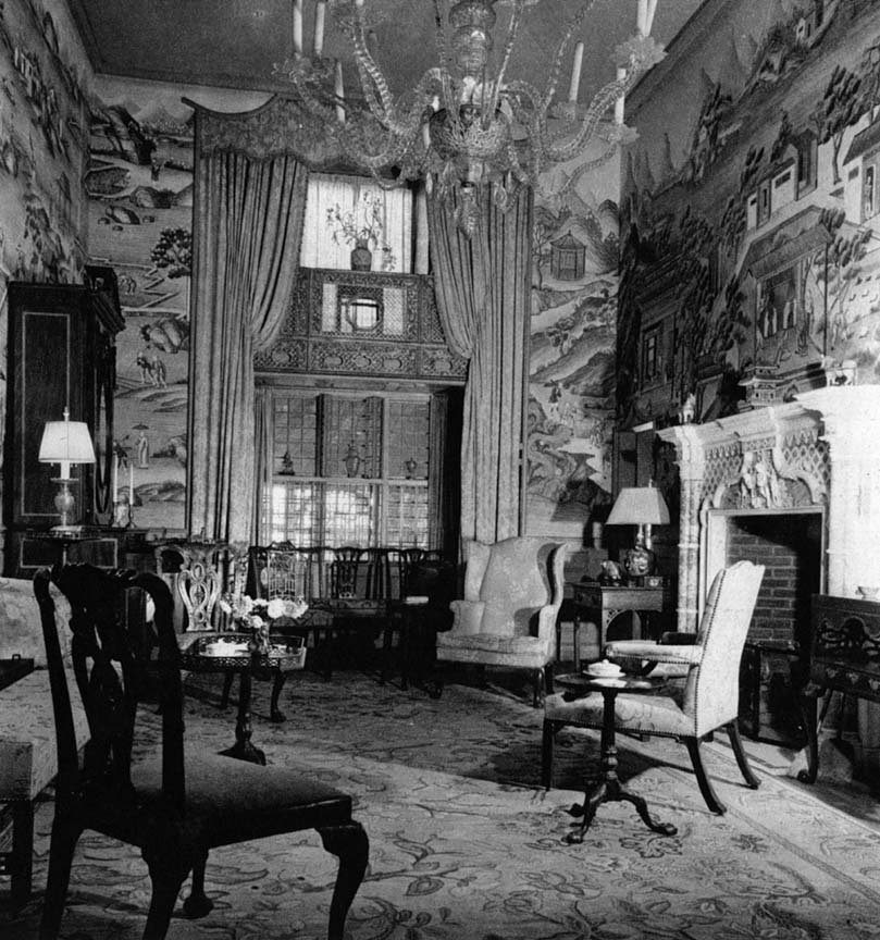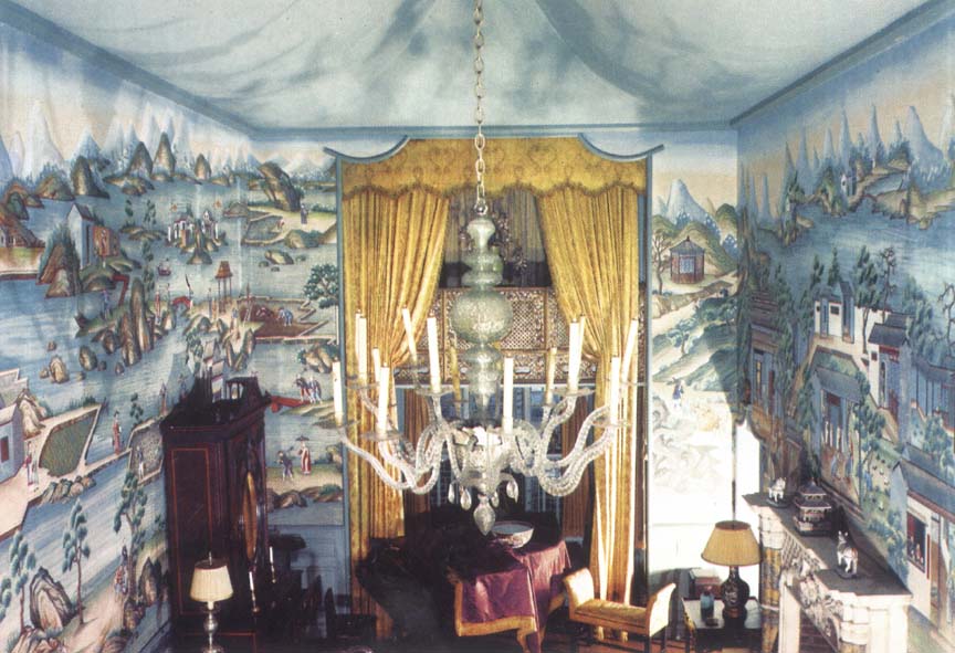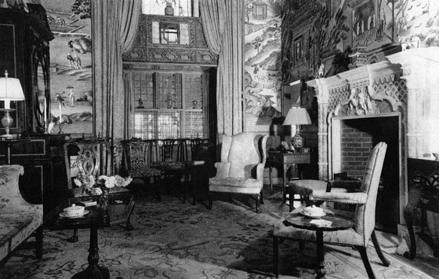 | Mrs. McCann transformed this extraordinary room from its next-earlier incarnation (still earlier it had been a chapel), into the opulent Georgian-Chippendale drawing room you see here. It is "keyed" by a unique hand-painted Chinese paper imported, but unused, for the mansion of Lewis Morris, the 'Signer.' It lay fresh and hidden in the attic of a Marblehead house for over a century. The furniture today is of English pedigree. Carved and pierced gold screens serve as rails for the twin galleries at either end. The ceiling curves in-and-upward to the rooftree, as in a pagoda. The chandelier is of fairly unbelievable Waterford. |