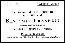 The inauguration ceremony for the Franklin Monument given by Mr. John H. Harjes to the City of Paris will take place this afternoon at 2 PM at the Trocadéro Palace. All the members of the American Colony will be present to render homage to the memory of the famous philosopher, one of the signers of the Declaration of Independence, the negotiator of the treaty of alliance with France and first ambassador in Paris from the American Republic.