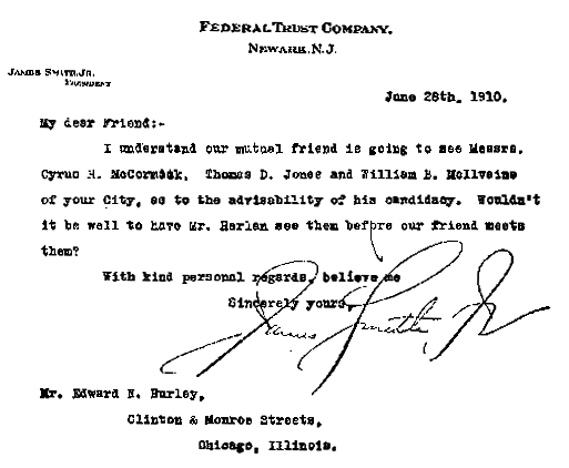 Within the last two or three days Mr. Smith, who, I believe, dominates the Democratic organization in New Jersey, was in Chicago, and my friend, Mr. Edward N. Hurley, knowing my regard for and admiration of you, utilized the opportunity of talking with Mr. Smith, whom he knows pleasantly, about the political situation in New Jersey and the possibilities in that connection with reference to yourself. Mr. Smith welcomed Mr. Hurley's suggestion that possibly he might arrange, through me, to have you and Mr, Smith lunch with him some day in the near future when he may be in New York. Mr. Smith said that he would be glad of an opportunity to talk with you and learn what would be your attitude toward the Democratic organization in New Jersey in the event you were nominated Democratic candidate for Governor and elected, Mr. Smith expressing the opinion that you would win "in a walk" if you were nominated. Mr. Smith did not say what Mr. Hurley, however, did vouchsafe, confirming the impression which I already had. that Mr. Smith was in a position to bring about your nomination without difficulty. Mr. Burley said very positively that Mr. Smith had not the slightest desire that you commit yourself in any way as to principles, measures or men, but that he would wish only to be satisfied that you, if you were elected Governor, would not set about fighting and breaking down the existing Democratic organization and replacing It with one of your own. In other words, Mr. Smith's thought seems to be the quite natural one that an organization in control of the machinery of nomination of the Democratic party in New Jersey could hardly be expected to proceed with enthusiasm to the nomination and election of a Governor who, after being so nominated and elected, would feel it his duty or make it his business to turn upon and wreck that organization. I suppose that Mr. Smith's solicitude on that score is simply a manifestation in the political field of the natural law of self-preservation --- the self, however, to be preserved not being his own personality (that presumably being beyond the need of anyone's help or the fear of anyone's attack), but rather the organization of which he is the master or dominating factor.