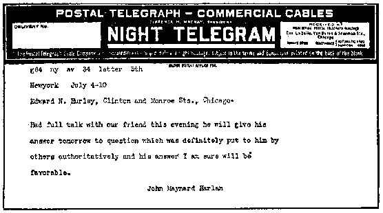 On the morning of July 5th I received the following telegram from Harlan, in which the words "our friend" refers to Doctor Wilson and "other" to Senator Smith: