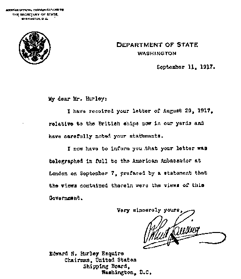 Not only did protests come from domestic shipping owners, but we were deluged with protests from foreign owners who had placed contracts for the building of ships in American yards. The issue thus raised presented an international aspect. Foreign builders through their respective governments took up the question with the State Department. On August 23, 1917, I received a letter from Secretary of State Lansing with a letter from the Rt. Hon. Arthur J. Balfour which was forwarded by cable(7) by Ambassador Walter H. Page, in London, to the State Department.
