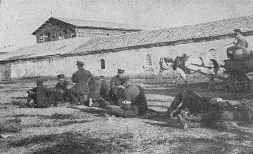 Monastir is a city without cellars, a city for the most part of flimsy mud walls, through which an obus crashes like a hammer through an eggshell. About all one can hope for in a bombardment is that by sticking close to a house the smaller éclat may be stopped. We had plenty of time to realize this as we flattened out against a building, on the other side of which was a gaping hole, the result of a former bombardment. As we lay there we speculated as to the welfare of the fellows at quarters, for the shells all seemed to be falling in that locality. We speculated on the size of the missiles, deciding that they were H. E., and finally we speculated on whether they were coming nearer. Up to that time they had been dropping at a distance which we estimated as possibly three hundred yards. Now they seemed to be coming nearer. We accordingly moved, going down towards the center of the city, where we once more became "wall-flowers." We were particularly disgusted. To be strafed on Christmas Day, "mustered for foreign service," before the only real meal in months, was surely the refinement of cruelty, worthy of the Huns. There was no help for this, however, and so, while the people at home were on their way to church, we lay beside a mud wall in a Balkan town, liable any minute "to go out" without benefit of clergy, and wondered, perhaps, if after all the "life of safety first" was not preferable.