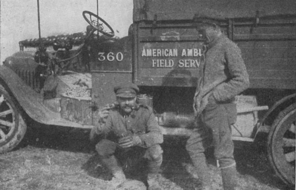 WE had reached Sakulévo on the afternoon of the twenty-fourth of November. On the morning of the twenty-fifth we started to work. On the other side of the river was a cluster of tents. It was a field dressing-station and, appropriate to its name, was located in a muddy field. Since Sakulévo was at this time some thirty kilometers from the fighting, our work consisted of evacuations, that is back of the line work, the most uninteresting an ambulancier is called upon to do, since it wholly lacks excitement. Here it was made more trying because of the fearful roads over which our route lay. At this time the village of Eclusier, some forty kilometers southeast of Sakulévo was rail head and to this point we evacuated our wounded. It was a matter of three and a half hours of the most trying sort of driving. Perhaps a better idea of our work at Sakulévo may be had if we go together on a "run." It's seven-thirty in the morning, a cold raw morning with ice on the pools and a skim of ice on the inside of the tent. The sun has not long appeared over the snow-clad mountains and there is little warmth in its rays. We have just had breakfast---heaven save the name---some black coffee and army bread---so it's time to be off. The crank up---a none too easy performance, since the motors are as stiff with cold as we are, and then toss and bump our way across the little bridge disregarding a sign which, in five languages, bids us "go slowly." A couple of hundred meters farther on in a field at the left of the road is a group of tents, before which whips a sheet of canvas displaying a red cross. It is the field dressing-station. We turn the car, put on all power and plough through a mire and then out upon more solid ground, stopping in front of the tents. A short, stocky soldier with a heavy beard and the general aspect of Santa Claus comes out.