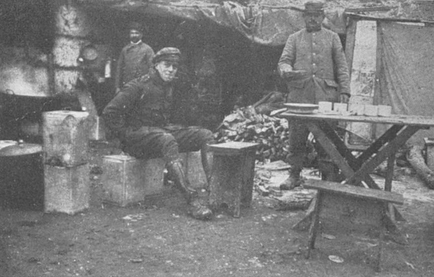 Though we had changed our quarters, we still messed with the sous officiers at the ambulance. With characteristic French courtesy, they insisted on giving us the best of everything and welcomed us as one of themselves. We shortly grew to know their individual characteristics and to feel entirely at home with them. We ate in a stone room, which had evidently been the kitchen of a considerable establishment. The table was waited on by the cook who, in the democratic way of the French army, took part in whatever discussion happened to be going forward. He was as comical a chap as ever I have seen, short in stature, with sparkling black eyes and a voice like the rumble of an artillery wheel. His nose was so large the burden of carrying it around seemed to have bowed his legs, which were quaintly curved. His béret he wore at an astonishing angle curved down from a hump in the middle so that the headgear more nearly resembled a poultice. From somewhere he had secured a bright red waistcoat, the better which to display, he always appeared sans tunic.