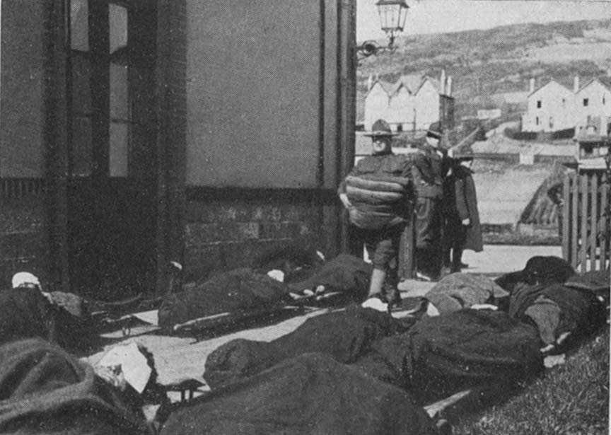 "Yes, many"; he answers. "Last night there was an attack; you heard the guns? Il'y'a tout couchés." So, since all your passengers will be stretcher cases, you pull down your third rack, assemble your stretchers and arrange your blankets. A number of wounded have now come out of the tent and are standing about. Later they will be removed as assis or sitting cases, but first the more urgent cases must be evacuated.