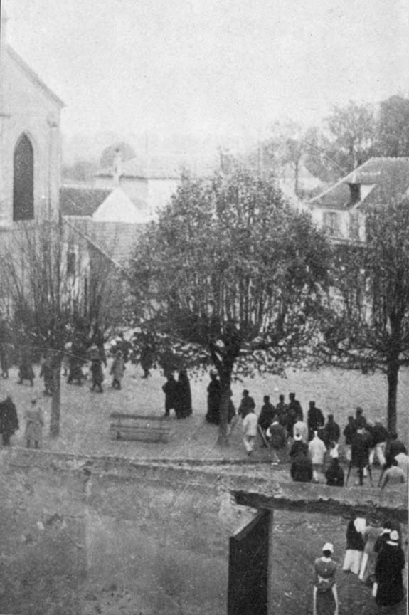 The soldier's funeral is sad and there is such simplicity and pathos that we were always affected, but came away with the feeling that the soldier had done a big and noble thing in giving his life for his country. The funeral processions started at the hospital and filed across the little square to the village church. The blessés were there, everyone who could make it---some on crutches, others with arms in splints and heads swathed in bandages. The village priest intoned the service assisted in the responses by the choir, consisting of one old man and a nun who played the church organ. The ceremony over, all who could walked to the cemetery on the edge of the village. The coffin was usually carried by a detail of artillerymen from the neighboring post. At the cemetery the coffin was deposited by the side of the freshly dug grave, the priest chanted the ritual, each one in turn sprinkled holy water on the bier and the crowd departed leaving flowers on the coffin. No salute was fired, as no powder is wasted. The booming of cannon towards Soissons always brought to us the reality of war.