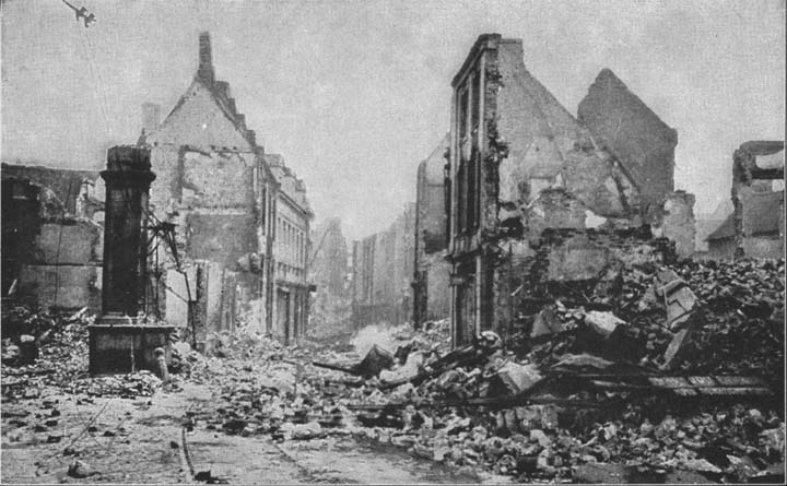 From where we stood we could see down the street through the smoke, as far as the Hôtel de Ville. It was still standing, but the Cathedral across the street was badly damaged and smoke was rising in clouds from its roof. The business houses beyond were not to be seen; the smoke was too dense to tell how many of them were gone.