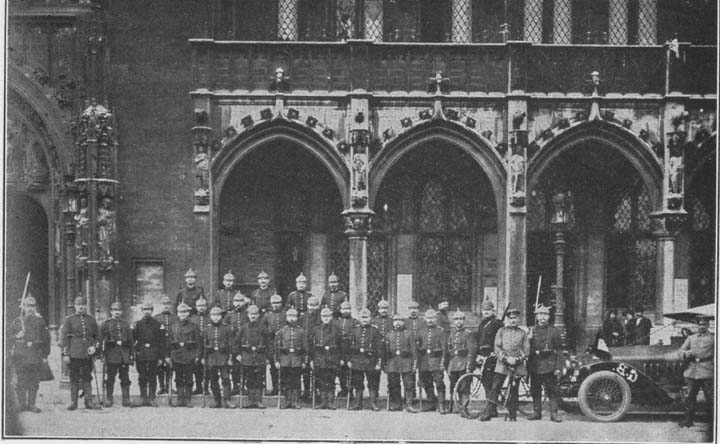 Before we left Lierre, nine troopers of the Landsturm were marched into the hallway of the Hotel de Ville, to be examined by the officer who is there for that purpose. They were a depressed lot who had run away and given themselves up, so as to be spared the hardships and dangers of the rest of the war. They answered questions freely, telling all they knew as to the disposition of troops and making their getaway toward the local lockup with great alacrity as soon as the word was given to move. Most of them were Bavarians. Colonel Fairholme speaks German like a native. He talked with these chaps, and there was some interesting conversation. They were all without enthusiasm for the war, and all expressed indignation at having been brought out of the country, maintaining that the Landsturm cannot be used for anything except the maintenance of order in the Empire. I think they are wrong about that, but this was no joint debate on German law, and no attempt was made to sooth their injured feelings. A lot of men were brought in while we were there, some of them prisoners taken during the fighting, but a great many of them fugitives who were sick of the war, and only asked to get off with a whole skin.