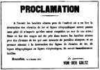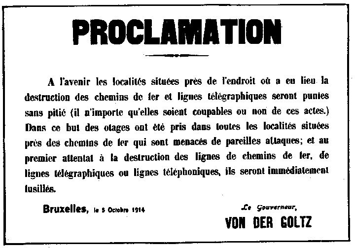 The population of Brussels, understanding well its own interests, has generally, since the arrival of the German troops, maintained order and quiet. For this reason, I have not yet forbidden the display of Belgian flags, which is regarded as a provocation by the German troops living in or passing through Brussels. Purely in order to avoid having our troops led to acting on their own initiative, I now call upon houseowners to take down their Belgian flags.