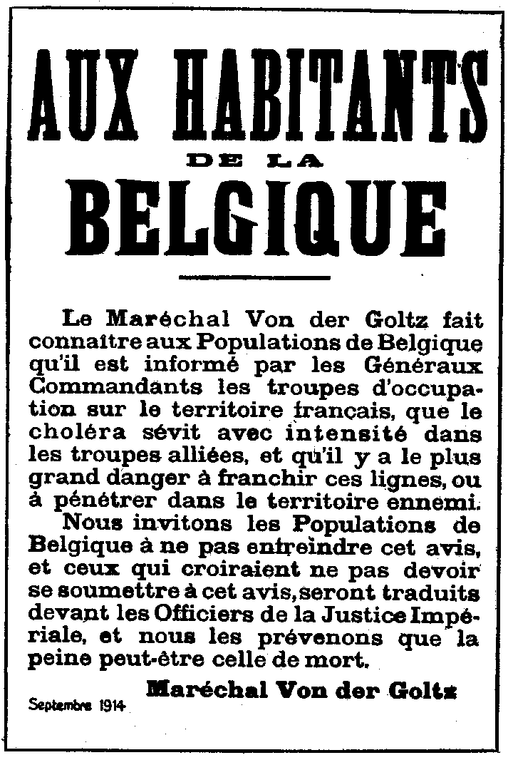 OF BELGIUM Field-Marshal von der Goltz announces to the Belgian population that he is informed by the Generals commanding the troops occupying French territory that cholera is raging fiercely among the allied troops and that there is the greatest danger in crossing the lines or entering enemy territory. We call upon the Belgian population not to infringe this notice. Those who do not comply with this notice will be brought before the Imperial Officers of Justice and we warn that the penalty of death may be inflicted upon them. |