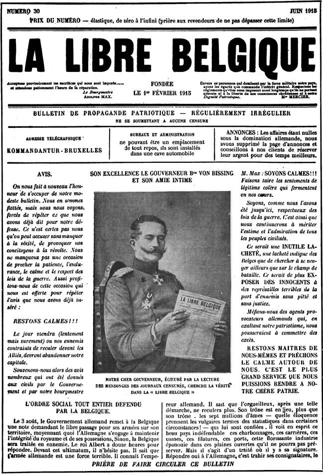 | La Libre Belgique, the clandestine paper printed in Brussels in 1915, which survived General von Bissing's reward for the discovery of its office and made fun of him by faking a picture of him reading their condemned paper. (1) |