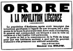 POPULATION OF LIÈGE The population of Andenne, after manifesting peaceful intentions toward our troops, attacked them in the most treacherous manner. With my authorization the general who commanded these troops has reduced the town to ashes and has shot 110 persons. I bring this fact to the knowledge of the City of Liège so that its people may understand the fate which awaits them if they assume a like attitude. |