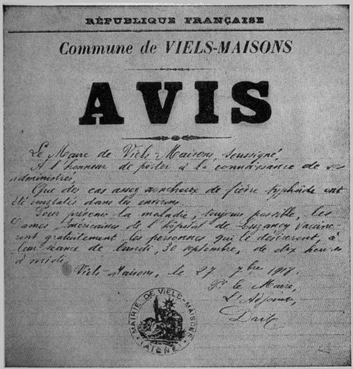 The town crier supplemented this announcement. The people assembled at the Town Hall where seventy-five were vaccinated by two of our doctors, who afterward went to the next commune to do similar work. A thorough antityphoid campaign was conducted throughout our district, with the result that this disease was on the decline when influenza appeared.