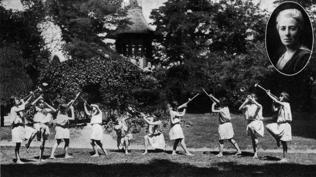 | Mlle. Marie-Jeanne Bassot (inset), head of the Résidence Sociale, Levallois-Perret, France. French factory girls dancing at a fête in honor of the American Women's Hospitals. |