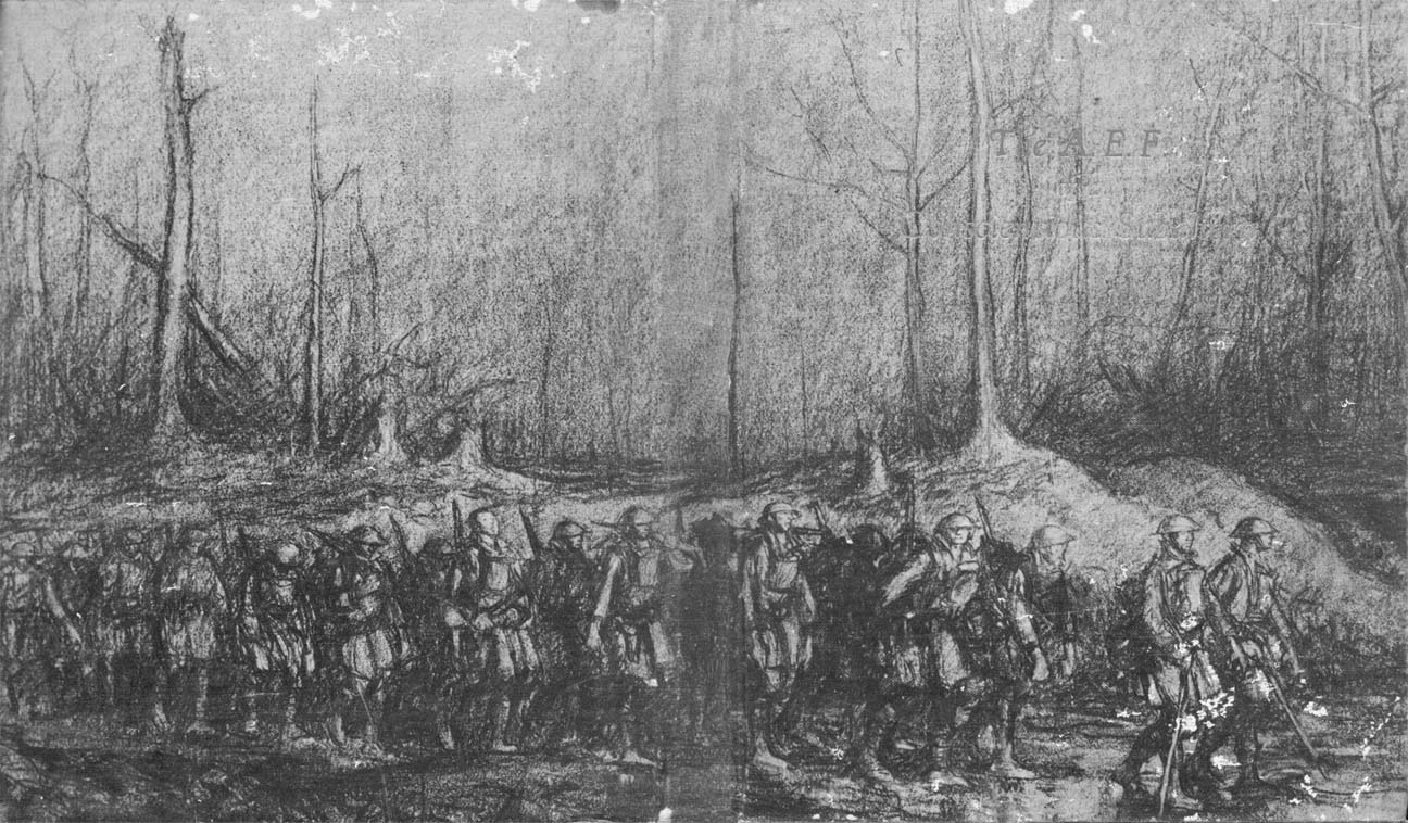 And in a surprisingly few moments we heard, coming down the slope to gain the road, the assembled battalions, wet and tired and wretched on their fourth sleepless day out, ready to march in column into the surprises of a heavily held enemy wood.