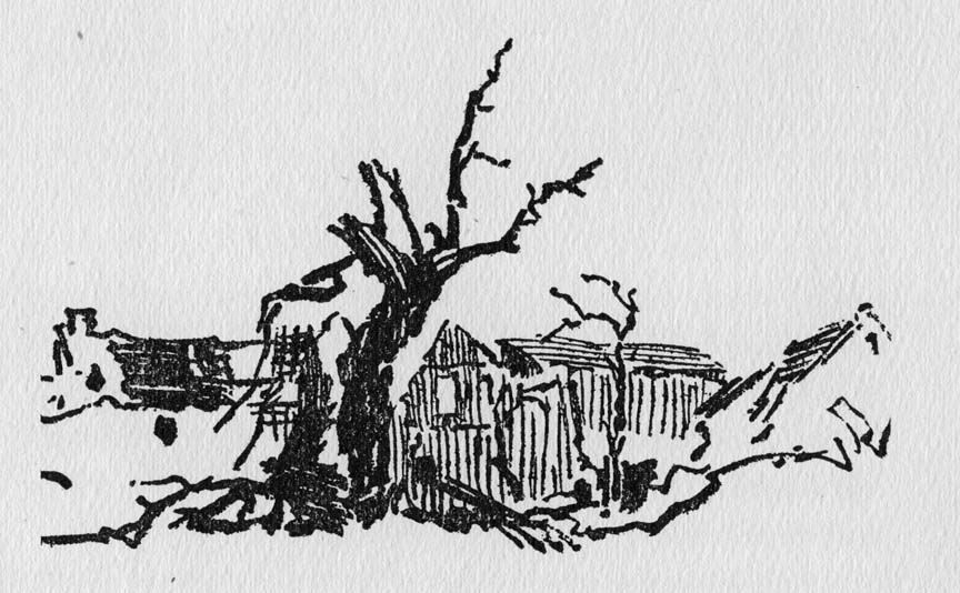 The southern edge of the Bois de Bel Val hissed and spat fire, and two valiant inspirations of mine to reconnoiter were very much dampened a few yards out of the farmhouse doorway. The building was coming down ---a very systematic barrage was busy at it---and we had decided for the hundredth time that day that it was a bum war and practiced asking the Old Man for a school detail or some job not so close to things.