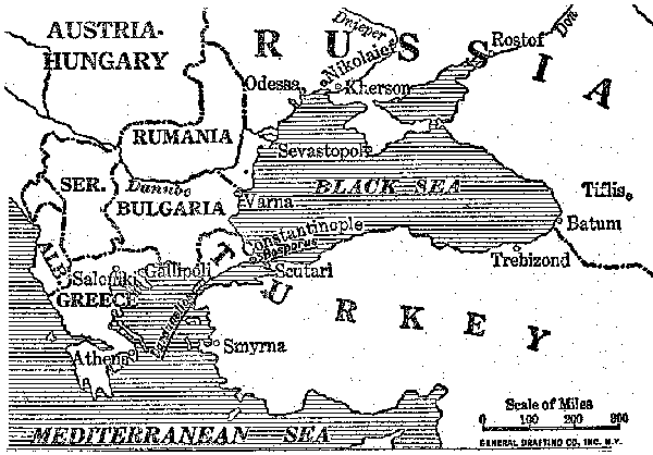 "We were lunching yesterday on deck," my daughter told me, "when I saw two strange-looking vessels just above the horizon. I ran for the glasses and made out two large battleships, the first one with two queer, exotic-looking towers and the other one quite an ordinary-looking battleship. We watched and saw another ship coming up behind them and going very fast. She came nearer and nearer and then we heard guns booming. Pillars of water sprang up in the air and there were many little puffs of white smoke. It took me some time to realize what it was all about, and then it burst upon me that we were actually witnessing an engagement. The ships continually shifted their position but went on and on. The two big ones turned and rushed furiously for the little one, and then apparently they changed their minds and turned back. Then the little one turned around and calmly steamed in our direction. At first I was somewhat alarmed at this, but nothing happened. She circled around us with her tars excited and grinning and somewhat grimy. They signalled to our captain many questions, and then turned and finally disappeared. The captain told us that the two big ships were Germans which had been caught in the Mediterranean and which were trying to escape from the British fleet. He said that the British ships are chasing them all over the Mediterranean, and that the German ships are trying to get into Constantinople. Have you seen anything of them? Where do you suppose the British fleet is? "