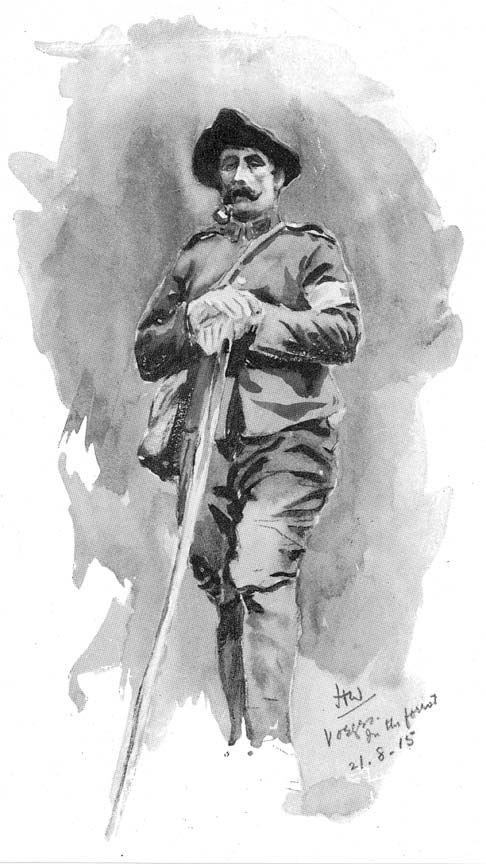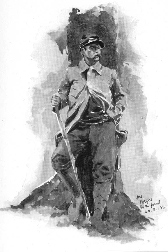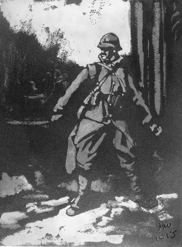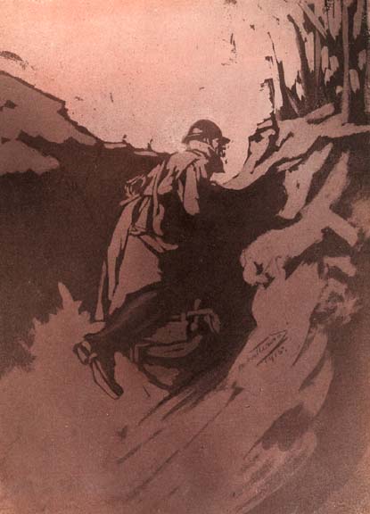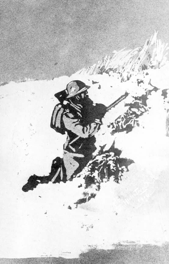 Fig. 1. A sentry'Le Poilu, c'est toi, c'est nous, ce sont tous les gars aux rudes coeurs et aux vaillants visages qui se hérissent des Vosges à la Mer du Nord et tiennent tête aux Barbares, en attendant le succès final.'