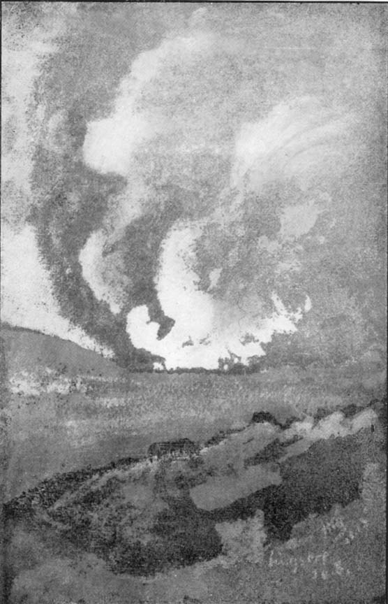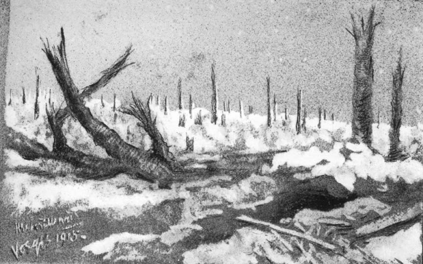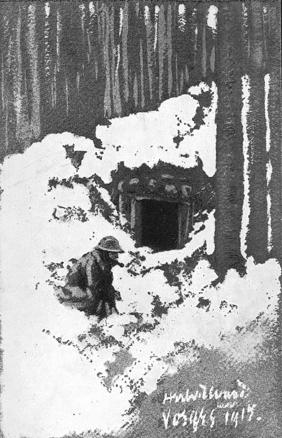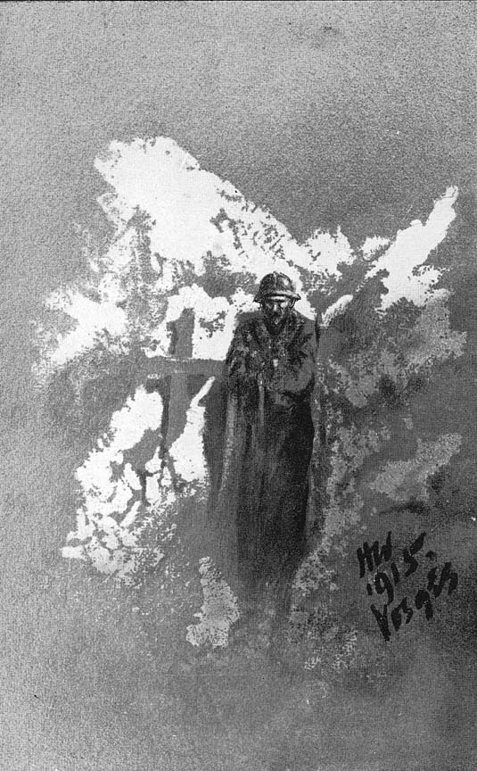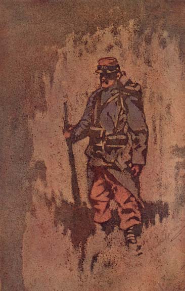 A sketch I once made in a trench at dawn, reminds me that I have seen rugged men, hardened by many months of exposure and peril, watching with appreciative eyes the glorious beauties of daybreak. I know how deeply they are moved by nature's grandeur, because I have had occasion more than once to read the letters of some of these fine French soldiers, written under shell and rifle fire, describing, for instance, in simple picturesque language to their women-folk at home the delicate silvery effects of colour-flooding, which herald the rising of the sun. This profound love of beauty is characteristic of their race, and the soldier inhabiting those living tombs would rather tell of the beauty he has seen in nature than of what he has known of strife and suffering. Here again we meet with that ever-present quality of contrast. Here is a man who at one moment would be capable of calling your attention to the warm tones of the distant snow-clad mountains, and the very next moment would sail in to batter out the brains of his enemy or to give away his own life willingly, without a second thought.
