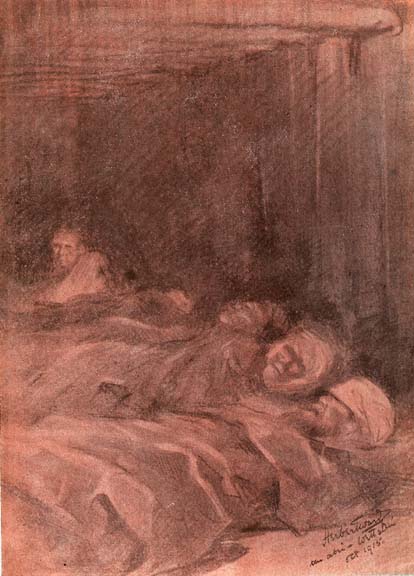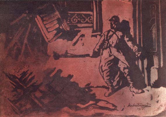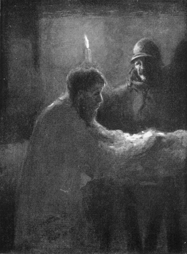 In continuing to narrate instances where the exaggerated qualities of light and shade produce effects which baffle description, I must not omit to mention the hospital- theatre in a small Alsatian town, within twenty miles of Gérardmer. Imagine the local theatre transformed from a playhouse, with all its gaudy accessories, into an improvised hospital for the reception of wounded. At the time of my visiting the place, the front line of trenches was within a distance of two miles, and a continual supply of wounded men was received at all hours by the eminent and indefatigable Dr. Capmas. By night, the scene within the theatre was extremely dramatic. The stage was lit by an oil hurricane - lamp tied to a portion of the scenic canvas.