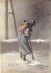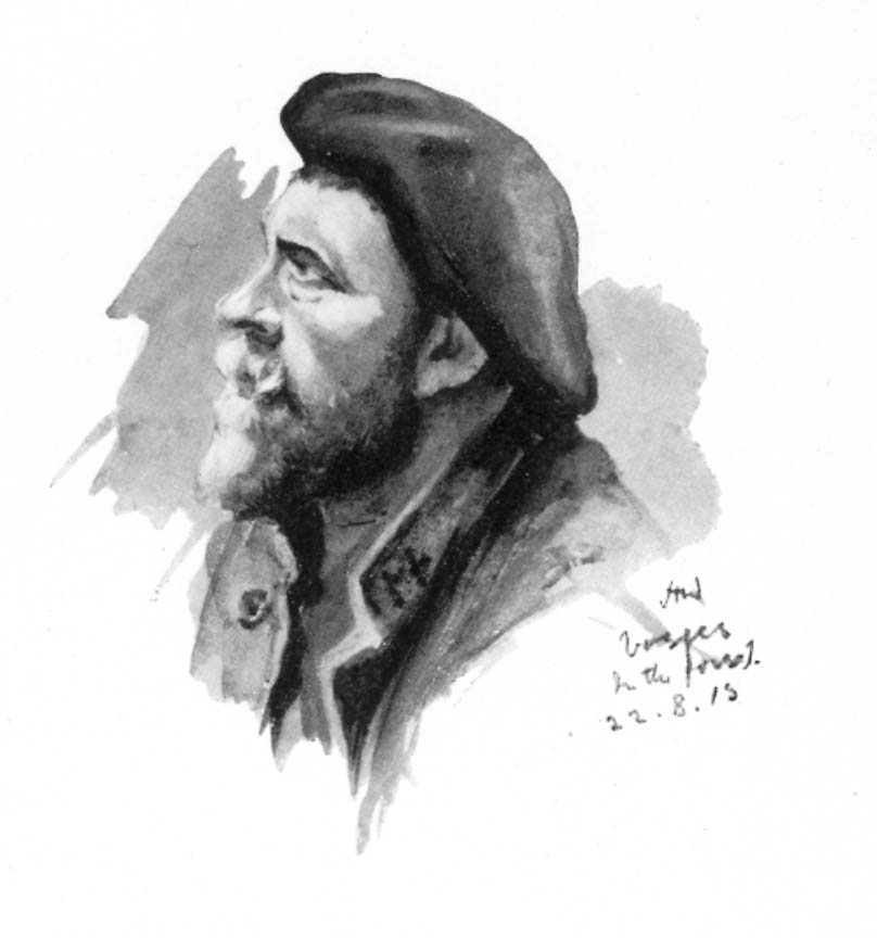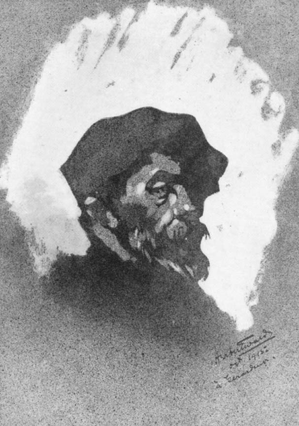 Bound eastwards on a special mission in April of last year, we lost a tyre near a little ruined village. Whilst waiting for the car, I stumbled about the heaps of cinders and wreckage, trying to find some subject for my sketch-book. The place was utterly sacked and destroyed; in fact there was not more than six or seven feet of any wall left standing. Suddenly in front of me, in the midst of the ruins, there appeared the figure of a little old man, with a ragged beard, and very dirty face. He had crawled out of a cellar by a ladder, and in view of the utter solitude of the place, his sudden appearance was certainly startling. He told me that he was out of luck. Kicking off his sabot, he showed me an injured foot, twisted and misshapen.