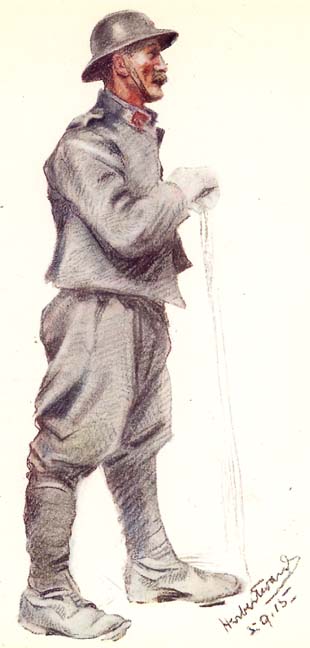 The typical Mr. Poilu has always a sparkle in his eye, a ruddy glow of health in his cheeks, and a general expression of bright, quick intelligence and good humour. There is apt to be a certain hardness and determination suggested by the lines around his mouth. He is invariably polite; one may truthfully say that the average French soldier has not alone the manner, but the instincts of a gentleman.