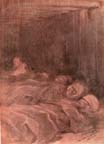 In a rough temporary shelter composed of planks lay a young French