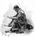 I was just commencing a little drawing of a soldier this afternoon, when a shell fell about fifty yards from us, killing three men and wounding several others. A small fragment from the exploding shell even left its mark upon my paper. Beyond turning his head for a casual glance, my soldier model remained immovable. I feel bound to admit that it was merely from a sense of shame on my part that I pretended to continue my work.