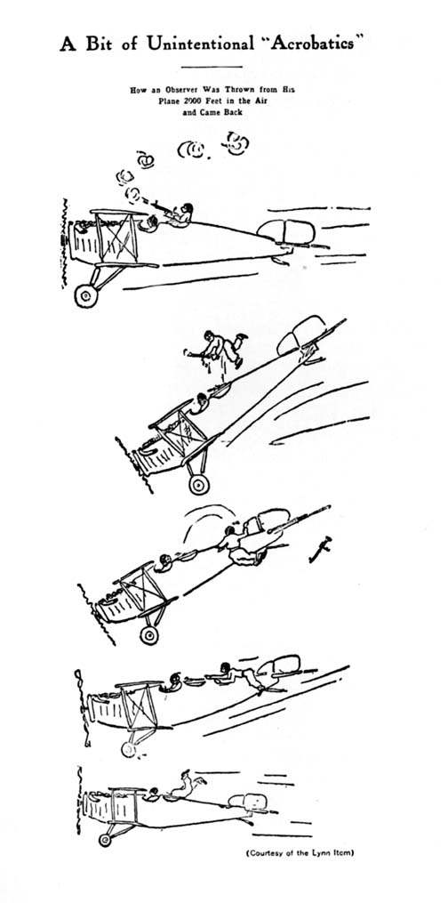 I HAD the thrill of my life yesterday. We were flying formation in these great big busses and the machine I had had two camera guns on it, one for the pilot and one for the observer. Old F---was standing up on the seat in back shooting away with his camera gun at a scout machine that was flying around us. At the same time I dove to get a shot at him with my gun. I heard sort of a crash behind, and after I had straightened out looked around to see what it was. Lo and behold, a man in a leather coat holding onto the tail of my machine. I could hardly believe my eyes, but F------ had fallen out of his cockpit when his gun broke loose from its fastenings and I had nosed over. The first thought that came to me was: Will he have strength enough to hold on till I get down to the ground? I put the machine in the gentlest glide I could and started for home, as I could not land where I was up on the mountain-tops. All this happened at about 700 metres. God help him if he had fallen. F------ all this time was lying with his body across the fuselage right next to the vertical stabilizer on the tail. As I watched him over my shoulder, he gradually wound his way up the fuselage. He got a-straddle of it and gradually slid up, caught hold of the tourelle, and dove head first into his seat. About ten years' weight came off my shoulders by this time. It was the funniest sight in the world to see the expression on that face as he scrambled up the fuselage and fell face first into the cockpit with only his heels sticking out. All that saved him was the little wooden spars that hold the covering of the fuselage breaking and making a sort of a hole in which his body stuck as it struck. As we were in formation, some of the other men saw it. They said that F------ left the fuselage bodily and flew through the air for a space of five feet till he struck the vertical stabilizer that knocked him back on to the fuselage. Of course, it is hard to believe, but it is Gospel truth. All the time it was happening we were going at the rate of 100 miles per hour at least.