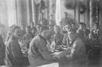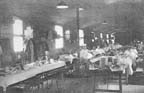 The first Thanksgiving in France was properly celebrated by all members of the unit. Turkey dinner with all the fixings was served in E hut. Food Controller "Pop" Steffens told everyone that "all youse need is a knife, fork and spoon, tres bon." After-dinner speeches were made by Sergeant Donovan, Butch Hall and others. When the festivities of the dinner hour were concluded an old-fashioned "horrible parade" was arranged for the entertainment of the patients. Later in the day the D.D.M.S. attempted to stop the parade in the downtown streets, because it attracted too much attention. The astonished medical director failed to account for such antics and inquired of Colonel Patterson over the telephone what sort of a holiday the men were celebrating.