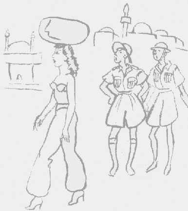 "As for the sun, a tan should be acquired on boat to destination --gradually. When there (Middle East) learn to fear the sun. Don't become a 'solar lunatic'. This applies to the terrific day heat. If you have to go out, walk slowly, and talk slowly. Seek to imitate the leisurely and dignified deportment of the Arab. When you awake in the morning drink a glass of water mixed with an effervescent saline. Follow up with hot tea. Constipation must be avoided. This is one of the best and least irksome ways of doing so. A tepid bath O.K. ---- cold water NO! All meals up to sundown should be as light as you can make them. After sundown is the time for the main, heavy meal of the day. Alcohol is best avoided during the day as well as heavy wines --- port, sherry. Uncooked salads in the tropics are extremely dangerous."