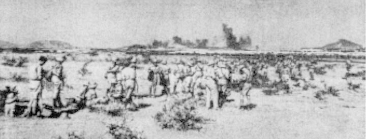 "When I last wrote you I think I said that we were in the process of going back for a couple of weeks rest after a fairly arduous period of continually being on the go. Well, we moved back to a delta city and settled down of all possible places in an old cattle pen on the outskirts of town. There jammed together in about the filthiest place I have ever been we spent 4 days swatting flies, chasing away the wogs, hunting for "Back-Sheese", and generally sweltering, in our own stew of annoyance. After having spent so many weeks in the wide open spaces in the fresher, healthier climate of the desert, we fairly hated the place. The town itself had sections which were very nice indeed, broad open avenues lined with trees, a couple of good movies, and a pleasant country club, but as always there were the other unescapable 9/10 of wog filth, noise, and smell. A few of our sections were still back in the desert, and having had a very rough time of it for a couple of weeks they needed relief badly. Accordingly, we packed up and started out to find them. We got pretty near them by road and then had to head across the desert for about half a day. Having nothing but a map and compass we had to stay right on our course all the time, and it was certainly tough going. This particular section was either rough going over jagged rocks or terribly bumpy travel through soft sand with a heavy growth of low bushes. The desert is monotonous and dull in one way, and yet once you learn to appreciate it and know it, it has a great deal of beauty and grandeur.