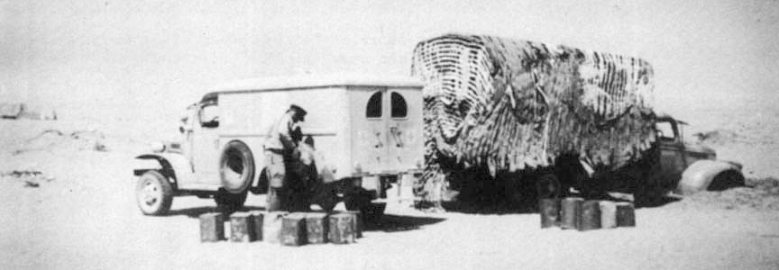 "Almost immediately after I mailed my last letter we started to prepare for the desert campaign. We turned our old ambulances over to a succeeding American Field Service Unit, entrained for a desert base where we were issued new ambulances, trucks, etc. which we had to get ready. We covered all the glass including the windshields with a mixture of oil and sand so that the sun would not be reflected in the glass and thereby attract planes and artillery fire. We also made camouflage nets to throw over our sand-colored vehicles to make it even more difficult to be spotted; and made such personal preparation as storing our kit and taking only the absolutely necessary clothing. The Mobilization Officer warned us to take nothing that we were not prepared to lose either through sudden movement orders or enemy action. Furthermore, the frequent sand storms (like talcum powder) ruin everything with their penetrating thoroughness. At this stage I decided to get out of the H. Q. Mechanical set-up and go out as an ordinary driver. Other fellows had this same feeling that we had volunteered to drive and did not want to miss getting into it; consequently, a British mobile workshop under Lt. M. and personnel of 14 were attached to us to remain behind us for repairs. A few of our gang hung on with them, but most of us went out in sub-sections of 5 ambulances and 8 men and were spread out over the desert.