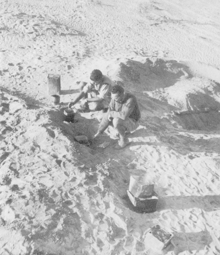 "Dishwashing out here is an art in itself. What with the scarcity of wells, and the number of these the enemy has spoiled, dishwater is about as common as ice-cream out here. There's usually at least a pail half full of warm sometimes soapy water, but this must do for the rinsing of mess tins of anywhere from 40 to 140 men. The water takes the food out of the inside, and leaves it on the outside as you take your dixie out of the water. Grease, of course, does not come out. Tea stains enamel mugs, and now that we're using the last inch of tea in lieu of nonexistent dishwater, the tea corrodes the metal mass tins; however, it is amazing how clean we can keep things. Now we're getting one canteen of water every other lay. Luckily each one of us has extra spare containers holding water collected at the last place where it was plentiful. This afternoon I made a fire of scrub bush and heated about a quart and a half of water, with which I washed three pieces of underwear, two pairs of socks, myself, and shaved besides.