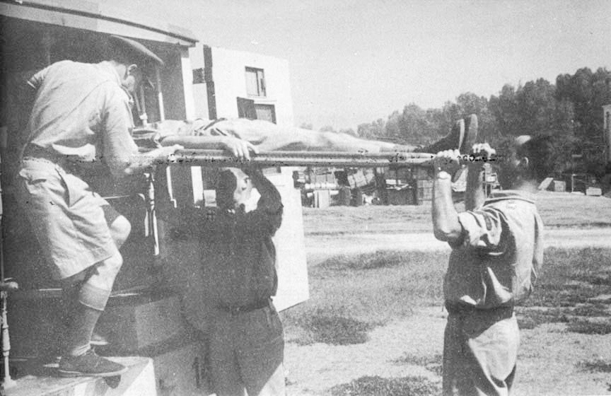 R.A.P. at the front, with an AFS ambulance in the distance. Western Desert. Wounded men, evacuated from Sicily, awaiting removal in AFS ambulances to a base hospital. Photo by William Emslie