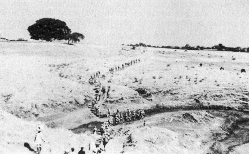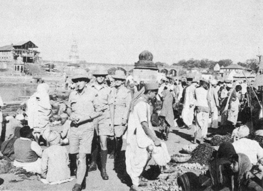 Three of the ambulance drivers use a day off to visit a bazaar in India. A group of AFS men set off on a conditioning march across the Indian plains.