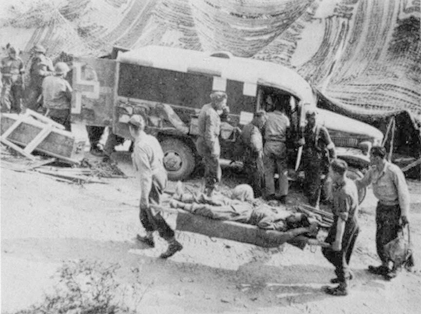 "The last few days have been busy ones for us. One day about noon the car post we were working from folded up, and we were sent back to an MDS. I no sooner got there than I picked up a load of patients to go to a CCS about 10 miles away. Upon delivering the patients I was loaded up with surgical supplies and sent back to the MDS. There I took on some more patients and started out for a MDS farther down the line. I arrived there about 1:00 A.M., then back to our camp. I crawled in the sack about 3:30. Most of the time, we make one run a day, but once in a while things get a but rushed."