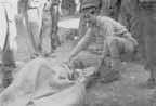"A few days ago I carried my first Jap wounded. They were four stretcher cases who had been found in a dug-out when the enemy retreated. Their wounds originally were not serious but they must have been in the dugout for days before they were found, for the wounds were badly infected. As with all patients, we offered them tea, bread, and cigarettes. They were only too glad to get these, and one went so far as to thank us in Japanese, or at least I think that was what he was talking about. For the most part, however, they were silent and seemed to ignore us entirely. Two M.P.'s, one with a revolver and the other with a Tommy gun, rode to the hospital with the Japs and me just to see that no harm came to them on the way. We stopped a few times and each time a small crowd would gather and peer in the back of the ambulance. Only a few who saw the Japs wished them any harm, but the few who did, mostly British soldiers who had been fighting them for some time, wanted to kill them on the spot."