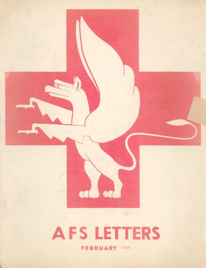 It was not until after the advance guard of 485, A and B platoons, had reached Italy however, that the men started talking of an identifying insignia of their own. Everyone wanted an emblem, but no agreement could seem to be reached on what device or design should be used. Finally it was decided to have a contest, the winner to get a $25.00 prize to make the Coy a distinguishing mark of its own. The griffin was chosen because this mythical creature with its half eagle, half lion body, seemed best able to represent the fraternity and cooperation between the AFS men and the British troops they serve. Shortly afterwards, the ambulances and other sundry 485 vehicles had brightly painted griffins on their front doors.